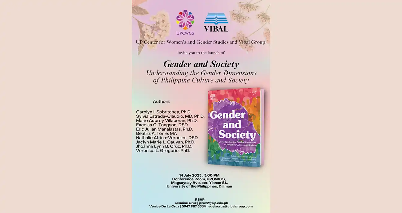 The University of the Philippines Center for Women’s and Gender Studies (UPCWGS) and the Vibal Group invite everyone to the launch of Gender and Society: Understanding the Gender Dimensions of Philippine Culture and Society on 14 July 2023 (Friday), 3:00 PM at the UPCWGS Conference Room.