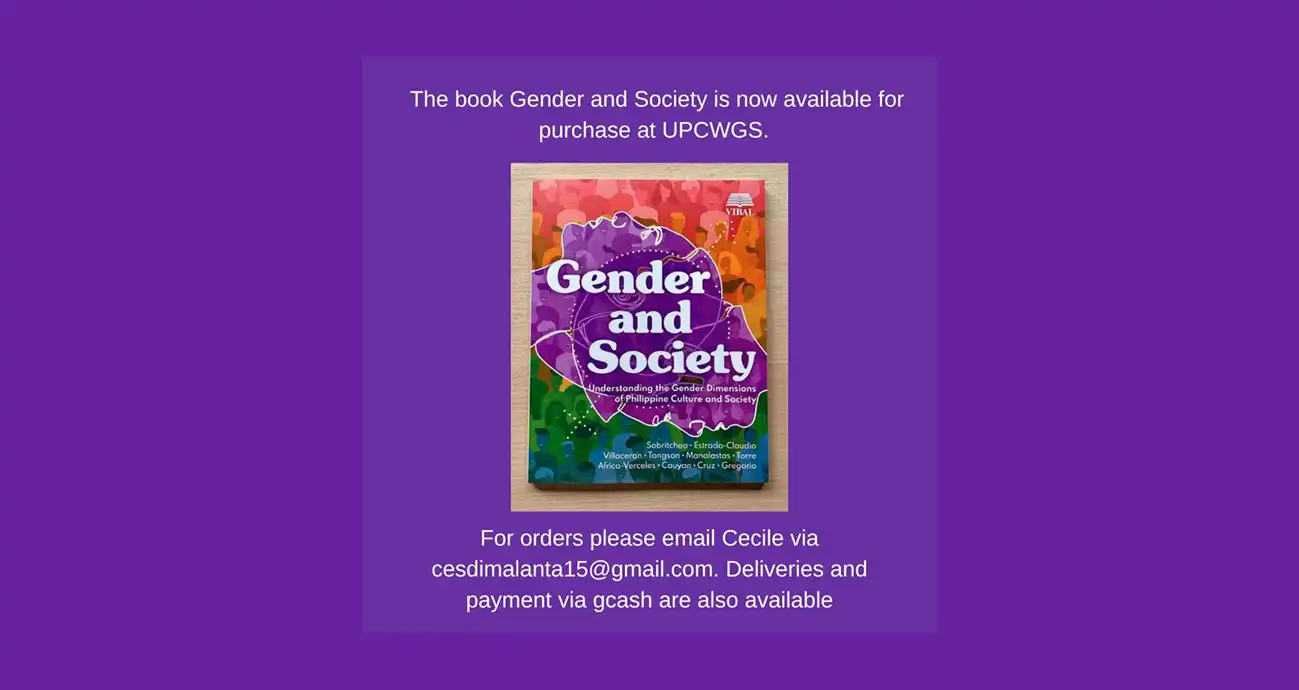 The book, Gender and Society: Understanding the Gender Dimensions of Philippine Culture and Society, by Carolyn Sobritchea, Sylvia Estrada-Claudio, Marie Aubrey Villaceran, Excelsa Tongson, Eric Julian Manalastas, Beatriz Torre, Nathalie Africa-Verceles, Jaclyn Marie Cauyan, Jhoanna Cruz, and Veronica Gregorio is now available for purchase at the University of the Philippines Center for Women’s and Gender Studies (UPCWGS) for P650 per copy. For orders, please email Cecile via [email protected]. Deliveries and payment via GCash are also available.