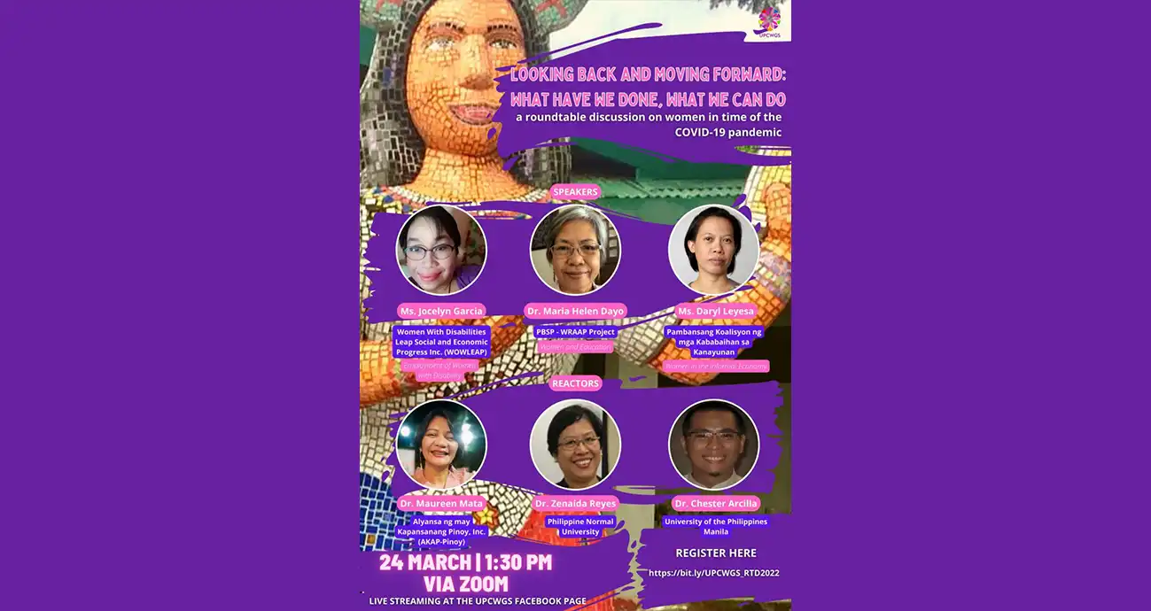 The University of the Philippines Center for Women’s and Gender Studies (UPCWGS) invites everyone to attend Looking Back and Moving Forward: What Have We Done, What We Can Do, a roundtable discussion on women in the time of the COVID-19 pandemic, on 24 March 2022 (Thursday), 1:30-3:30 PM via Zoom. This will also be live streamed at the UPCWGS Facebook page.