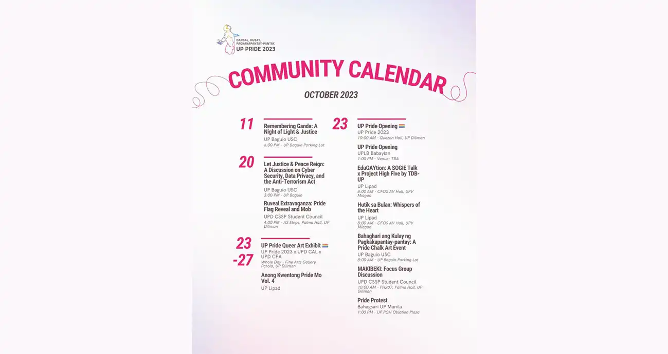 Here is the official lineup of events for UP Pride 2023! These are made possible in coordination with the different LGBTQI organizations in the UP System.