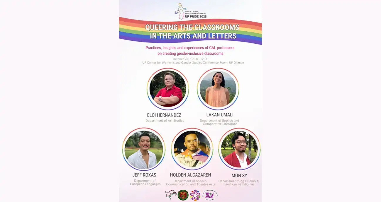 In celebration of UP Pride 2023, the University of the Philippines (UP) Diliman College of Arts and Letters, in partnership with the UP Center for Women’s and Gender Studies (UPCWGS) and UP Pride, will hold a lecture series on Queering the Classrooms in the Arts and Letters. Five faculty members from the College will share their best practices, insights, and experiences in teaching courses of their expertise from a gender-sensitive standpoint: Prof. Eloisa May Hernandez of the Department of Art Studies, Ms. Lakan Umali of the Department of English and Comparative Literature, Asst. Prof. Jeff Roxas of the Department of European Languages, Asst. Prof. Holden Kenneth Alcazaren of the Department of Speech Communication and Theatre Arts, and Asst. Prof. Jose Monfred Sy of the Departamento ng Filipino at Panitikan ng Pilipinas. This will take place on 25 October 2023 (Wednesday), 10:00 AM – 12:00 NN at the UPCWGS Conference Room.